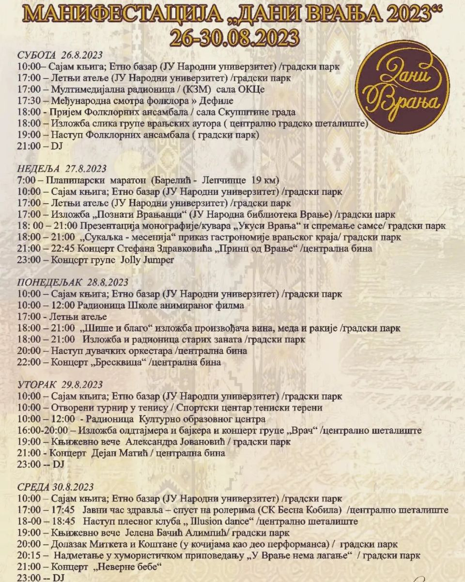 Istovremeno, „Dani Vranja“ trajaće četiri dana, od 26. do 30. avgusta, a na ovoj manifestaciji nastupiće četiri glavna izvođača – Stefan Zdravković (Princ od Vranje), Breskvica, Dejan Matić i bend Neverne bebe, uz prateći program. Ovi nastupi, zajedno sa celokupnim pratećim sadržajem, koštaju više od 51.000 evra.