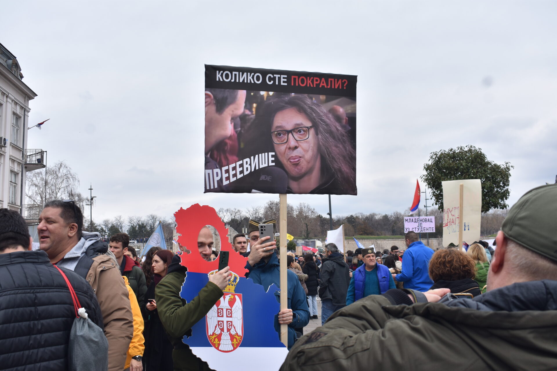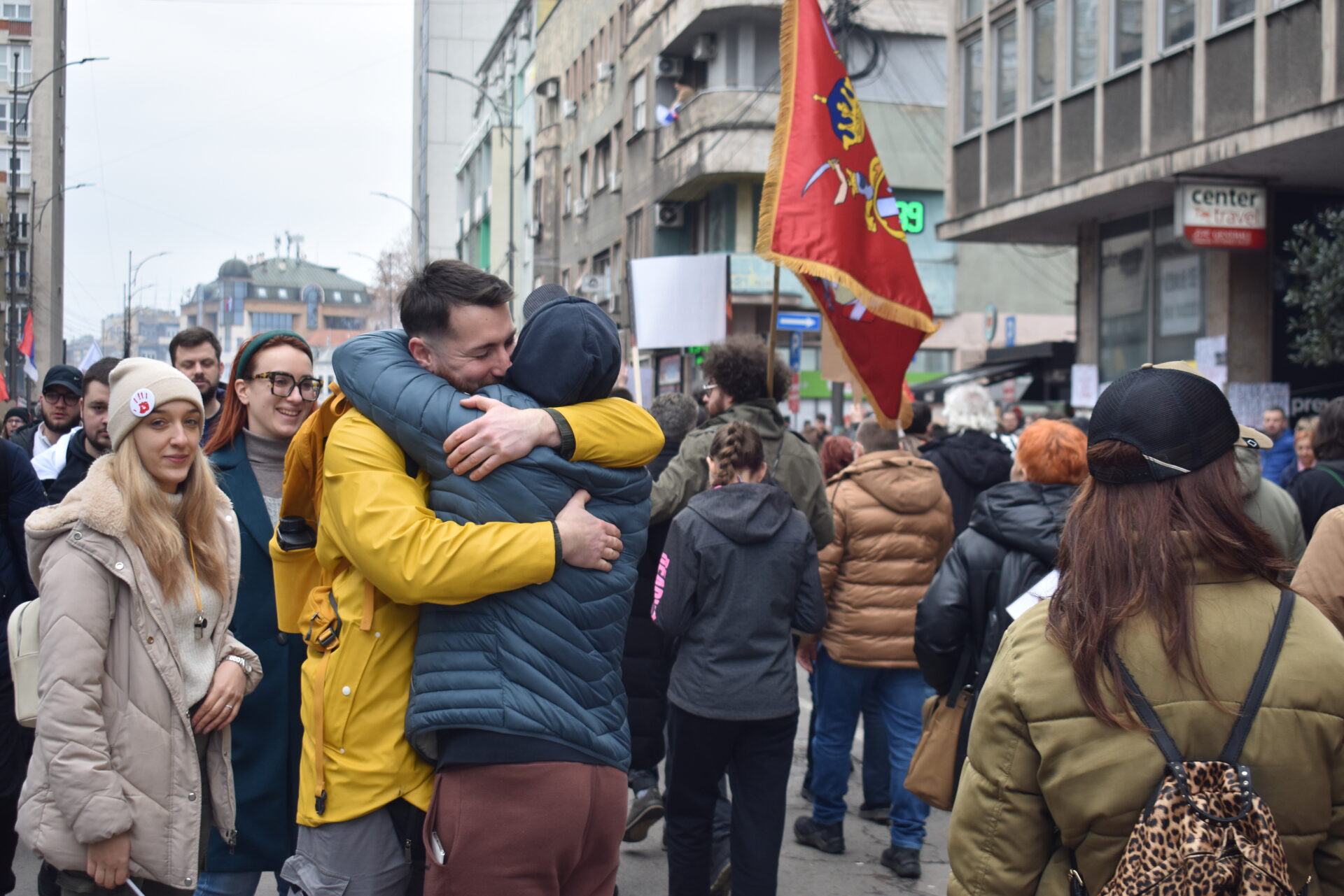 Studenti nose zastave fakulteta, bezbroj je i srpskih. Ogrnuli se ljudi zbog hladnoće koja ume da ošine pod vito rebro. A i bliska im trobojka srcu. „I zastava, i ljudi, i država iz koje neće da odu, već bi da ostanu“.