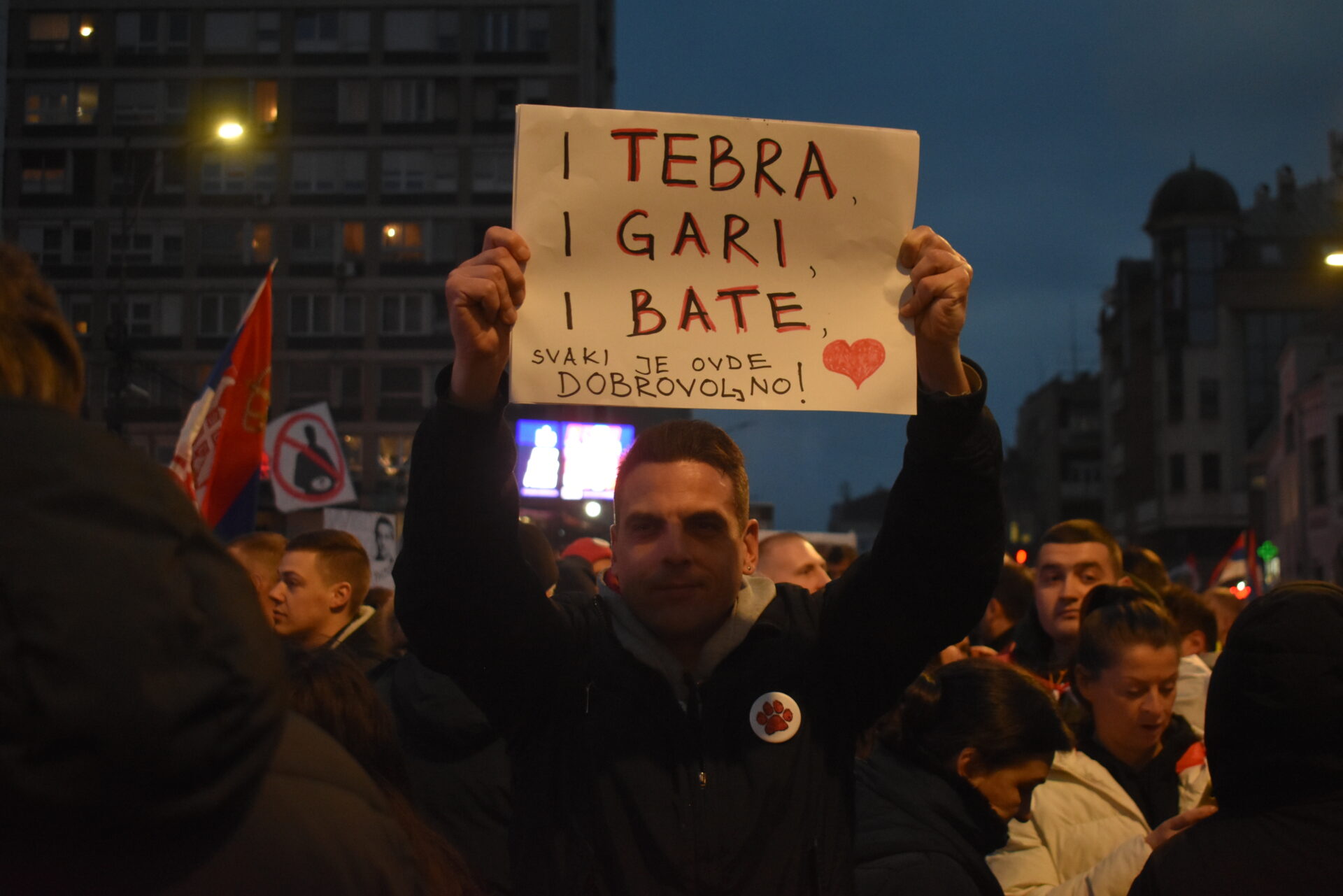 „Niški Beograđanin“, kako se predstavi, nosi transparent „I tebra, i gari, i bate. Svaki je ovde dobrovoljno!“