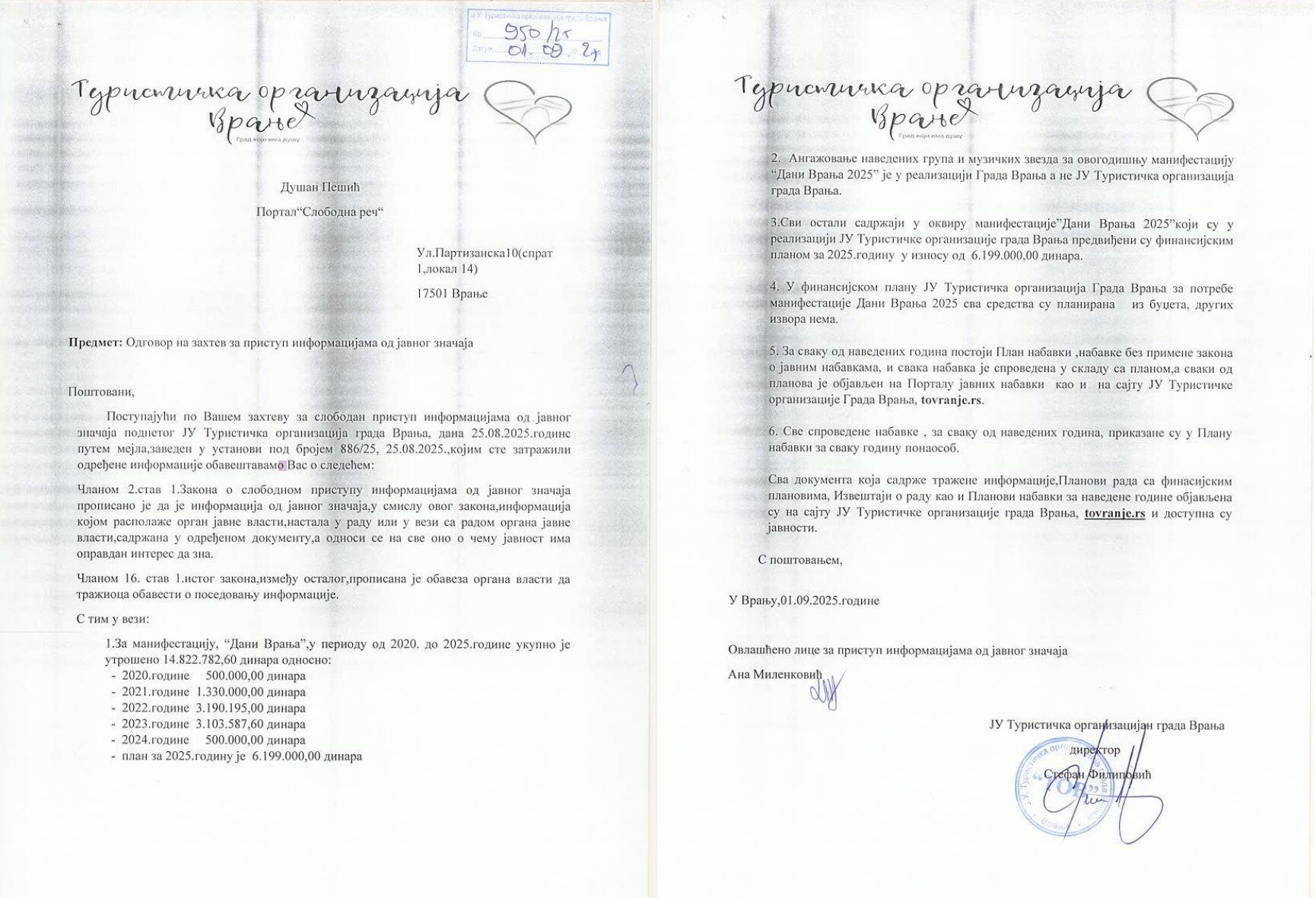 Novinari portala Slobodna reč poslali su zahteve za pristup informaciji od javnog značaja na dve relevantne adrese, Gradskoj upravi i Turističkoj organizaciji Vranje (TOV) – sa istim pitanjima – pre svega sa namerom da narod razume koliko je novca, iz njegovog džepa, otišlo na organizaciju „Dana Vranja“ od 2020. do 2025, uključujući i navedene godine; posebno na glavne muzičke izvođače. Iako su i iz TOV i iz Gradske uprave na zahteve odgovorili, odgovori na pitanja – posebno na ona koja se tiču trošenja novca – bili su nedovoljno jasni i precizni.