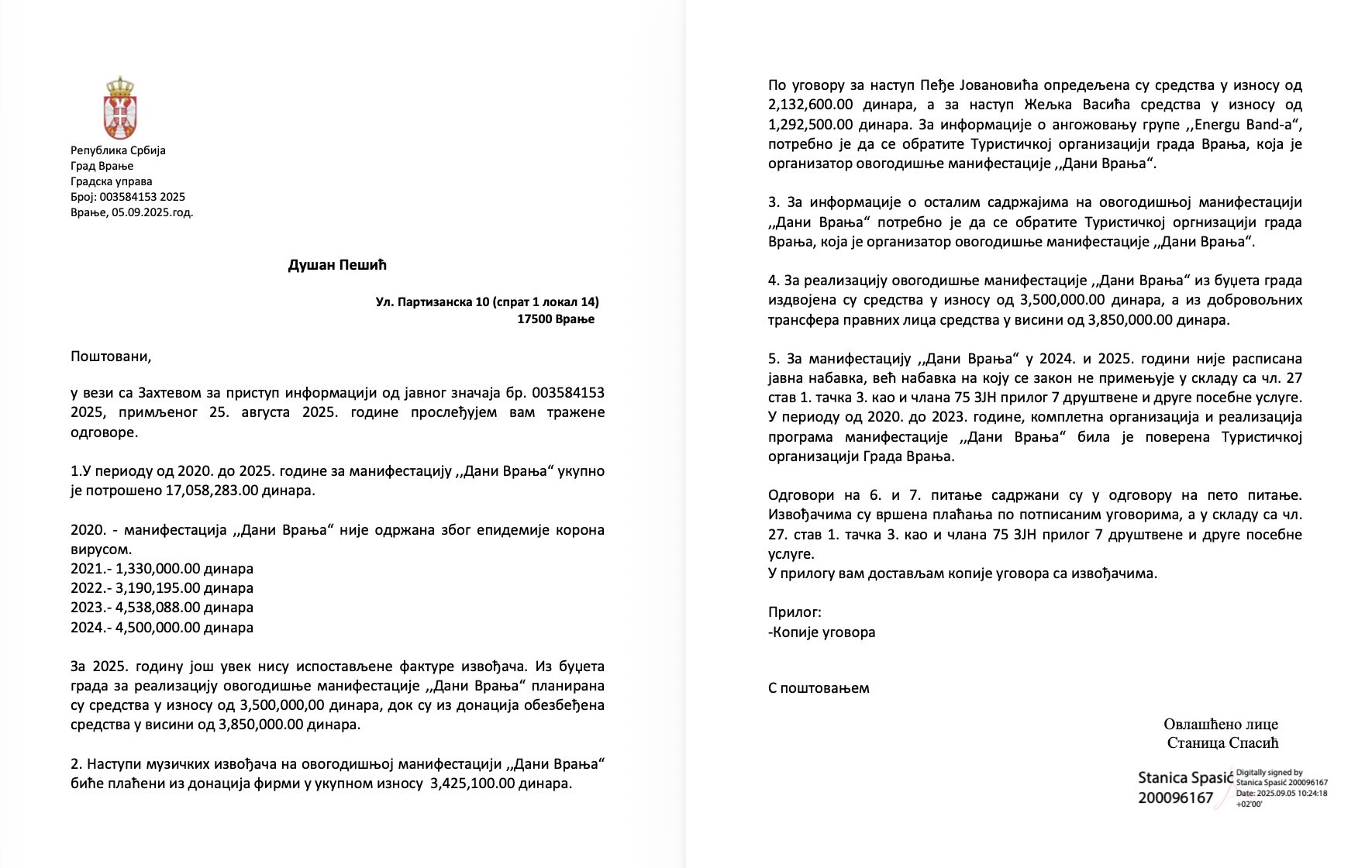 Iz Gradske uprave su napisali da tada, u momentu slanja odgovora na Zahtev, „za 2025. godinu još uvek nisu ispostavljene fakture izvođača“, kao i da su, „iz budžeta Grada, za realizaciju ovogodišnje manifestacije ‘Dani Vranja’ planirana sredstva u iznosu od 3,5 miliona dinara, dok su iz donacija obezbeđena sredstva u visini od 3,85 miliona“. Sa druge strane, iz TOV su odgovorili da je, u finansijskom planu za 2025, predviđen trošak za ovogodišnju manifestaciju u iznosu od skoro 6,2 miliona dinara (6.199.000).