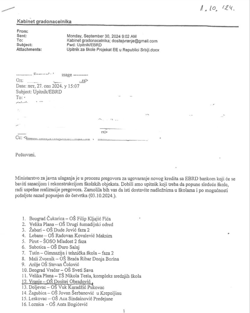 U kopiji dopisa Ministarstva za javna ulaganja gradonačelniku, od 30. septembra, navodi se informacija da je Ministarstvo u procesu pregovora za ugovaranje novog kredita sa EBRD bankom „koji će se baviti sanacijom i rekonstrukcijom školskih objekata“, kao i spisak na kojem se nalazi ukupno 16 škola u Srbiji za koje će se država zadužiti, a na kojem se navodi i naziv škole u Vranju.