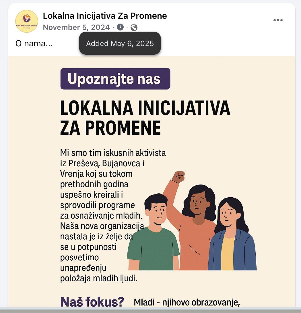 Administratori ovog profila su 6. maja 2025. godine postavili prvu objavu, koju su „antidatirali“ na 5. novembar 2024. godine, da bi izgledalo kao da je nastala u vreme registracije udruženja. Ista je situacija sa najmanje devet narednih objava.