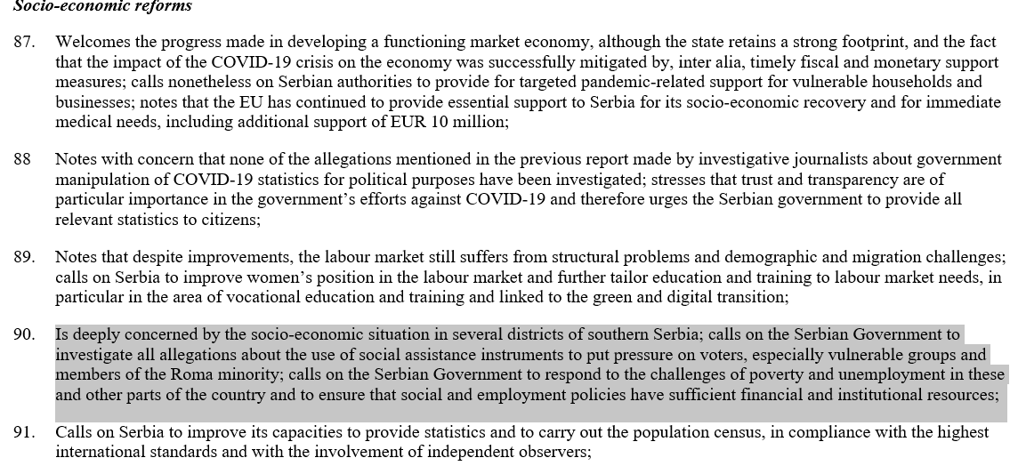 Kako se navodi, EP je izuzetno zabrinut socio-ekonomskom situacijom u nekoliko okruga na jugu Srbije, i poziva Vladu Srbije da istraži sve navode o zloupotrebi socijalne pomoći kao instrumenta za pritisak na birače, posebno prema ranjivim grupama i pripadnicima romske nacionalne manjine, te da odgovori na izazove siromaštva i nezaposlenosti u ovim i drugim delovima zemlje i da osigura da politika socijalne zaštite i zapošljavanja ima dovoljno finansijskih i institucionalnih resursa.