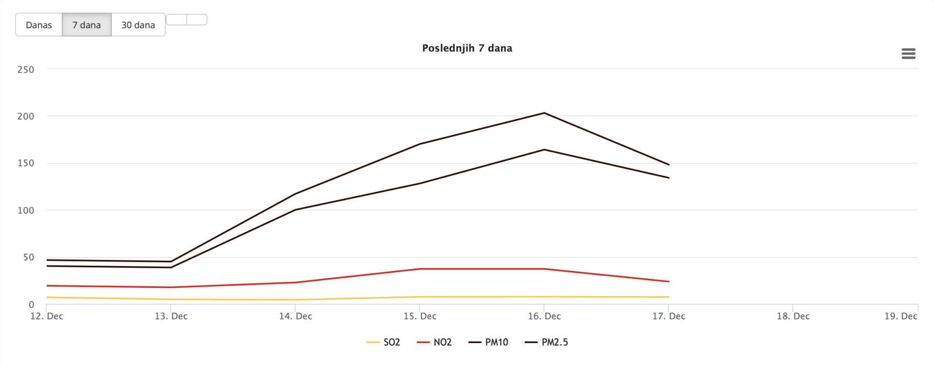 Vazduh je bio „veoma zagađen“ jedino u subotu, 13. decembra, a od nedelje, 14. decembra „ekstremno je zagađen“ bez prestanka.