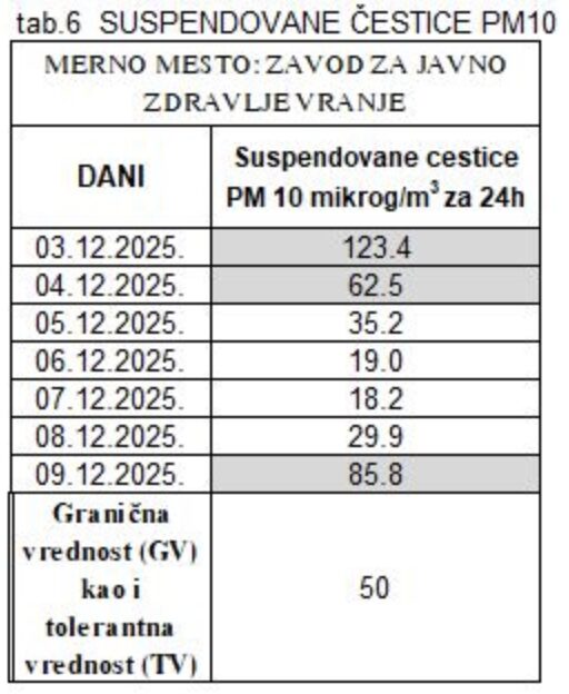 Podaci ZZJZ pokazuju da je prve nedelje decembra granična vrednost količine PM10 čestica u vazduhu pređena 3 puta, a da je vazduh bio najzagađeniji 3. decembra. Upoređujući ove podatke sa nezvaničnim merenjima kvalitet vazduha u Vranju kontinuirano je loš od početka decembra.